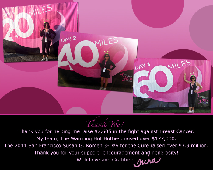 In the end, the 2011 San Francisco Bay Area Susan G. Komen 3Day for the Cure raised more than $3.9 Million. Our team, the Warming Hut Hotties raised over $176,000 and my supporters helped me raise $7,605. I couldn't be more proud to have had the opportunity to participate in this amazing event.