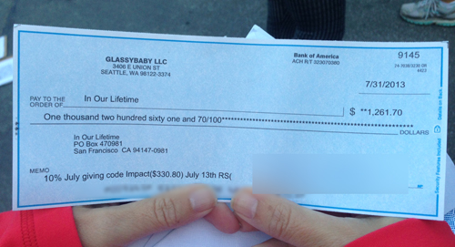 Just saw that the check from our July 2013 glassybaby San Francisco Roadshow Fundraiser was received and deposited! Between our glassybaby roadshow on July 13th, and the "impact" giving code used on orders online through the end of July, we raised a total of $1,261.70 towards my fundraising for the 2013 Immediate Impact Walk!!